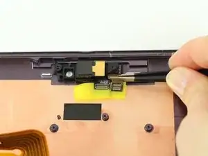 С помощью пинцета аккуратно извлеките левую камеру, которая является фронтальной, вместе с маленьким прикреплённым ленточным кабелем и отложите их в сторону.