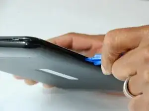 Используя большой пластиковый инструмент для раскрытия, начните с боковой стороны устройства и аккуратно надавите в шов между верхней и нижней внешними крышками.