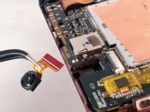 Будьте осторожны при извлечении камеры. С нижней стороны головки камеры находится клей, и она может быть приклеена к планшету. Если это произошло, используйте чёрную пластиковую лопатку, чтобы аккуратно поддеть нижнюю часть головки камеры и ослабить её прикрепление к планшету, прежде чем тянуть за гибкий кабель пинцетом.