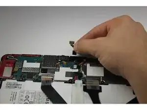 Соединение между аккумулятором и материнской платой — это группа из четырёх проводов в чёрном корпусе, расположенная в верхней средней части устройства. Используя пластиковую лопатку или тонкое плоское приспособление, поднимите чёрный разъём вверх, чтобы отсоединить его.