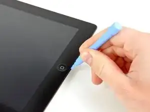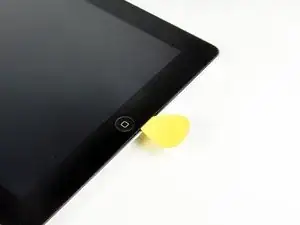 Используйте пластиковый монтажный инструмент, чтобы аккуратно создать небольшой зазор между передней панелью и внешней окантовкой справа от кнопки «Home».