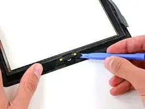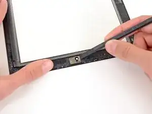 Проводите медиатором вдоль верхнего края iPad, слегка вынимая его, чтобы обойти кронштейн фронтальной камеры.