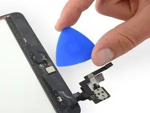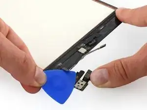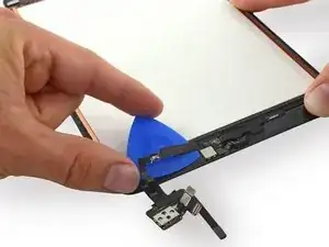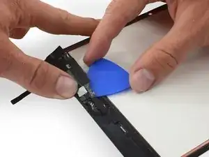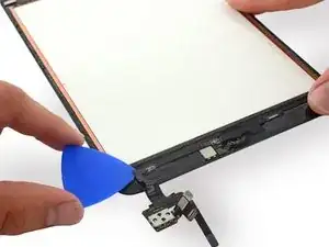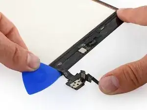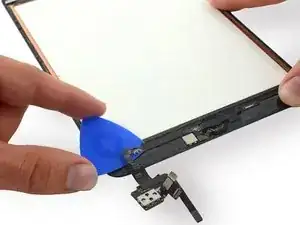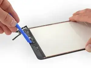 Используйте медиатор для разрушения клея, удерживающего шлейф кнопки «Домой» к шлейфу дигитайзера.