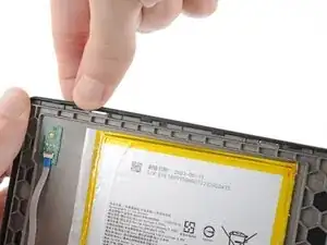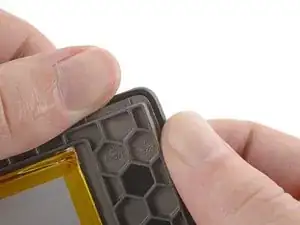 Нажмите на верхний левый угол передней панели, одновременно тянув экран в противоположную сторону, чтобы освободить защёлки и отделить клей.