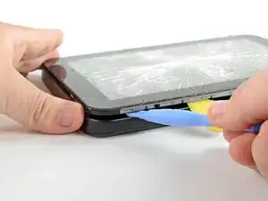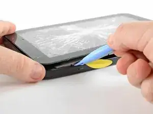 С помощью пластикового инструмента аккуратно создайте маленькую щель между передней панелью и задней панелью возле нижнего левого края.