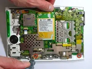 Снимите два (2) винта Phillips #00 (3 мм), которые крепят переключатели питания ON/OFF и Wi-Fi к устройству.