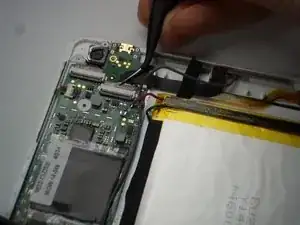 Далее используйте пинцет, чтобы отодрать ленту, прижимающую разъём к фронтальной камере.