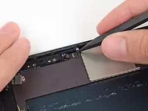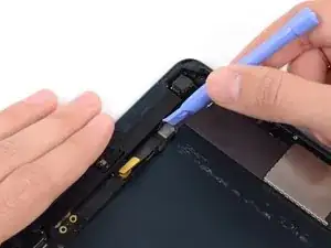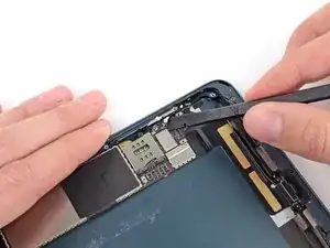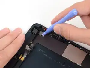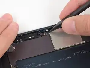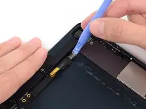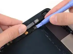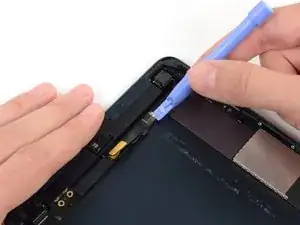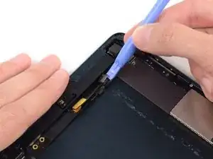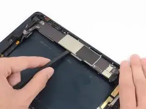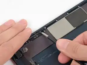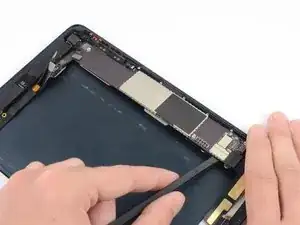 Используйте кончик лопатки, чтобы удалить маленький кусочек ленты, фиксирующий антенный кабель в правом нижнем углу iPad.