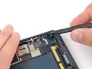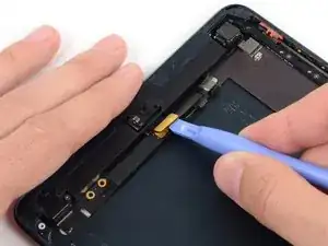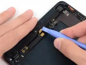 Просуньте плоский конец лопатки под кабель порта Lightning, освобождая его от клея, прикрепляющего его к задней крышке.