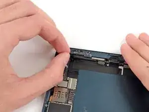 Потяните широкую ленту в сторону верхней части iPad, прикладывая постоянное усилие, чтобы отделить её от кабеля антенны между ней и динамиком.