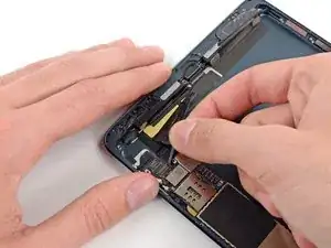 Поднимите край платы логики рядом с фронтальной камерой, чтобы убедиться, что он свободен от клея.