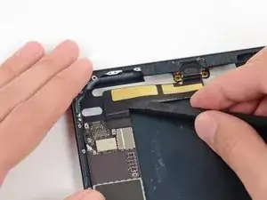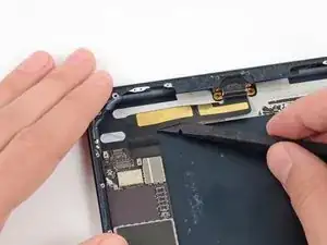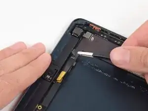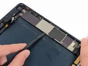 Используйте кончик лопатки, чтобы отслоить маленький кусочек ленты, закрывающий оба антенных кабеля в правом нижнем углу iPad.