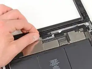 Продолжайте освобождать клей вдоль верхнего края iPad и проведите пластину вокруг верхнего левого угла.