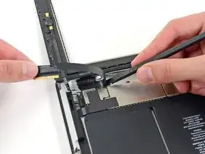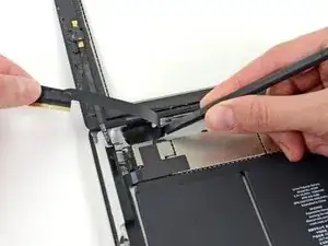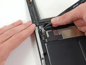 Проведите открывающей лопаткой вдоль левого края iPad, отрывая клей по ходу движения. Клей здесь тонкий из‑за дигитайзера вдоль всей левой стороны. Убедитесь, что лопатка не входит слишком глубоко (макс. 1/2 дюйма) 10 мм, чтобы не повредить дигитайзер.