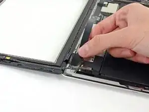 Пальцами вытащите шлейф дигитайзера из его посадочного места в алюминиевой рамке.
