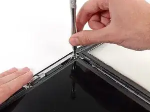 Может потребоваться некоторое усилие, чтобы зафиксировать кончик инструмента между стеклом и пластиком. Работайте терпеливо и осторожно, покачивая пластиковый инструмент взад-вперёд по необходимости.