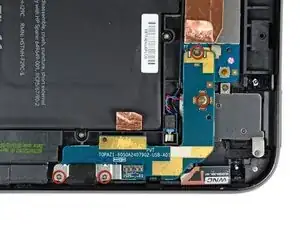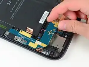Плата USB-разъёма всё ещё прикреплена к моторчику вибрации. Не извлекайте плату полностью пока.