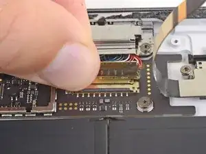 Используйте плоский конец лопатки, чтобы выдернуть кабель межсоединения дисплея прямо вверх из его гнезда на плате.