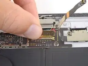 Используйте плоский конец лопатки, чтобы выжать соединительный кабель дисплея прямо вверх и вынуть его из разъёма на плате.