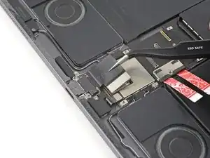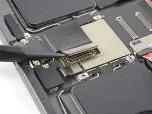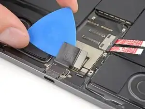 Используйте острие лопатки, чтобы поддеть и отсоединить коннектор нажатия порта USB-C от материнской платы.