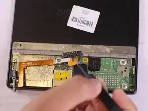 Используя металлическую лопатку, пинцет и кончики пальцев, аккуратно приподнимите оранжевый разъём-мостик сначала с материнской платы, а затем от Kindle.