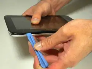Вставьте пластиковый инструмент для открытия между серебряной задней панелью и экраном. С угла устройства с обеих сторон подденьте шов на расстоянии примерно 2.5 см.