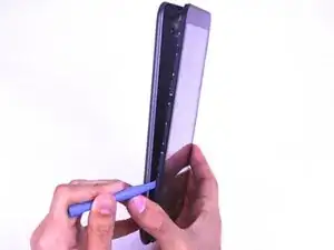 С помощью пластикового инструмента приподнимите угол корпуса, затем продолжайте по боковой стороне устройства, чтобы полностью открыть корпус.