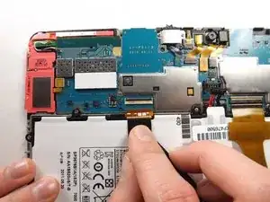 Вставьте плоский конец усиленной лопатки между проводами и под разъемом батареи. Осторожно поднимите черный разъем батареи, чтобы отключить его от материнской платы.