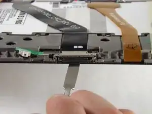 С помощью плоского конца усиленной лопатки осторожно поднимите черную вкладку, удерживающую кабель порта зарядки на месте.