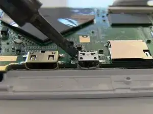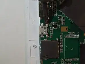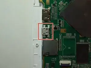 Положив устройство лицевой стороной вниз, порт зарядки USB расположен на левой стороне устройства непосредственно на материнской плате. Порт mini HDMI находится выше порта зарядки, а слот micro SD — ниже, при этом порт зарядки расположен между ними.