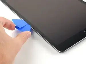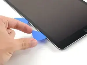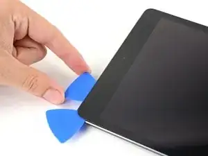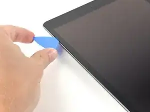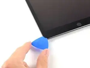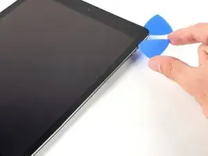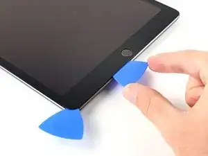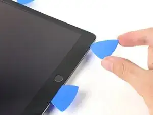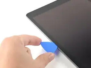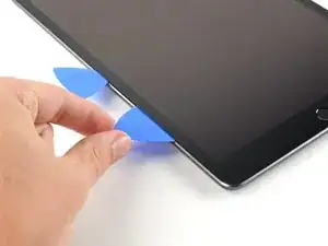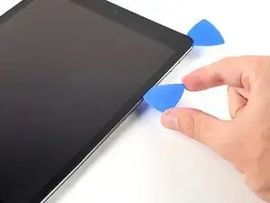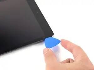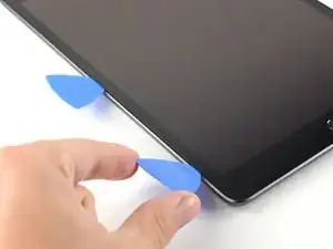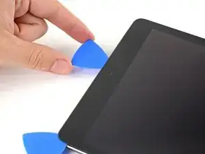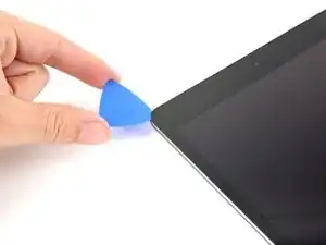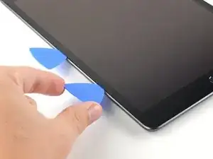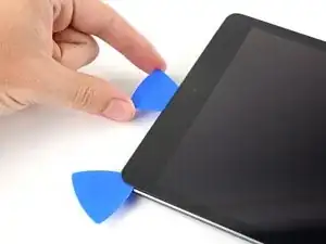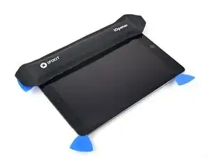 Поверните два раздвижных инструмента в левых углах iPad, слегка приподнимая сенсорный экран и отделяя остатки клея.