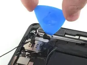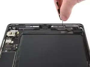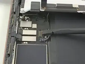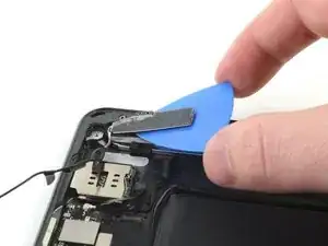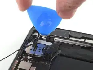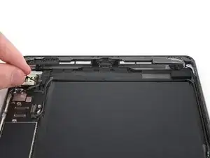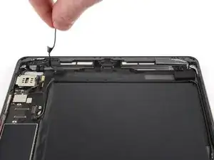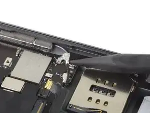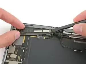 Отделите левый антенный кабель от задней крышки вдоль нижнего края iPad.