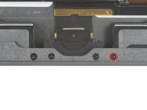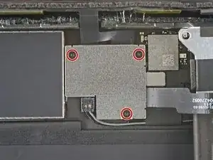 С помощью отвёртки по кресту открутите один винт длиной 2,3 мм, закрепляющий разъём аккумулятора на логической плате.