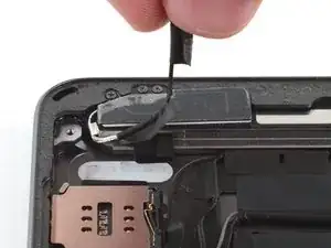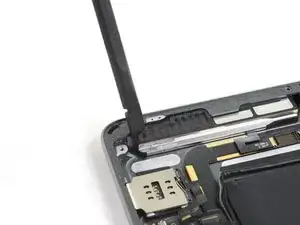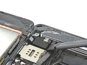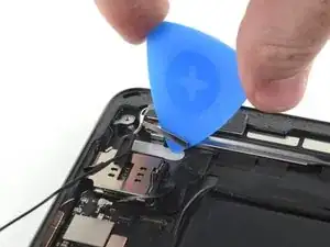 Кончиком лопатки, инструмента для вскрытия или ногтем поднимите маленькую поворотную защёлку на разъёме кабеля сим-карты с системой ZIF.