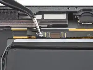Пинцетом аккуратно извлеките кабель правого динамика прямо из разъёма ZIF.