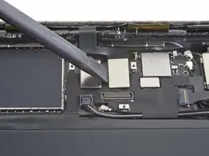 Обратите внимание, что на логической плате у разъёма аккумулятора имеются консольные пружины, прижимающиеся к контактным площадкам аккумулятора. Поскольку и логическая плата, и аккумулятор приклеены, вам нужно вставить тонкий и гибкий предмет между контактами, чтобы отключить аккумулятор.