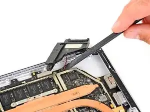 Начиная с зажимов, прилегающих к батарее, используйте открывающий инструмент, чтобы осторожно поддеть экранирующую пластину платы EMI прямо вверх под каждой стрелкой и отщёлкнуть зажимы.