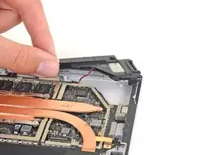 С помощью пинцета аккуратно отогните три куска серебристой ленты, приклеивающей экранирующую пластину платы EMI к медному радиатору.