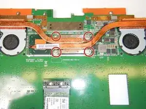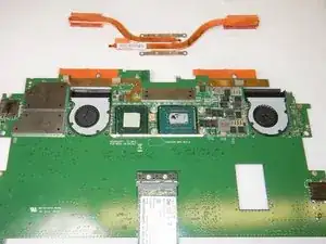 На тыльной стороне материнской платы найдите тепловой экран, расположенный между двумя вентиляторами в верхней части платы.