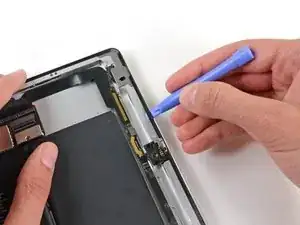 Используйте одну из вскрывающих пластин, чтобы поддеть нижний правый угол планшета, затем захватите его пальцами.