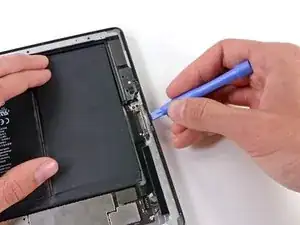 Антенна крепится к нижней части iPad винтами и кабелем. Данный шаг отсоединяет антенну от передней панели, что предотвращает её повреждение при снятии панели.