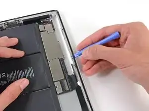 Аккуратно продвигайте пластиковый инструмент вдоль края iPad, отсоединяя клей.