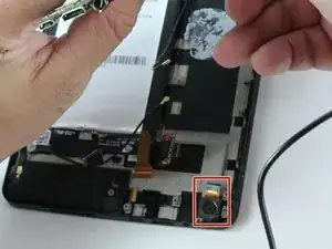 Перед тем как полностью извлечь материнскую плату, пинцетом отсоедините медный кабель задней камеры от материнской платы.