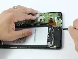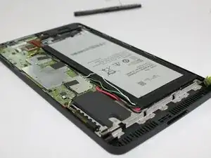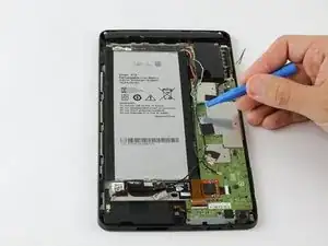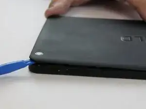 Начиная с разъема карты памяти Micro SD, воспользуйтесь синим пластиковым инструментом для вскрытия, чтобы аккуратно проходить по краям корпуса, оказывая небольшое давление для поднятия панели вверх.