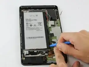 Как только аккумулятор достаточно ослабнет, воспользуйтесь синим пластиковым инструментом для вскрытия, чтобы поднять его из корпуса.