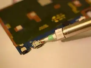 Используйте паяльный пистолет и, когда припой станет пластичным, подденьте левой стороной разъема зарядки до его отсоединения от платы с помощью пинцета.