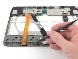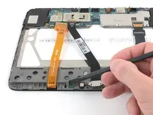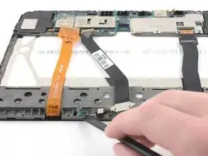 Используйте плоский конец полиамидной лопатки, чтобы открыть черную пластмассовую защелку разъема ZIF, закрепляющую ленточный кабель разъема зарядки.