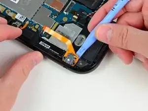 Используйте край пластиковой отвёртки, чтобы приподнять фиксирующий клапан ZIF-разъёма ленточного кабеля разъёма для наушников.