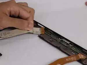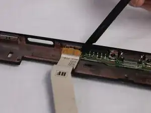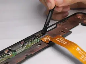 Правый ленточный кабель имеет разъём с фиксатором ZIF. Используйте плоский конец лопатки, чтобы приподнять маленькую запорную планку, затем вытяните кабель.