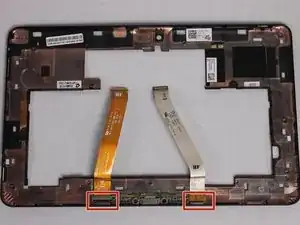 Между корпусом устройства и двумя отсоединёнными ленточными кабелями находятся клеевые полоски. Оттяните каждый кабель от корпуса немного, чтобы разорвать клеевые соединения.